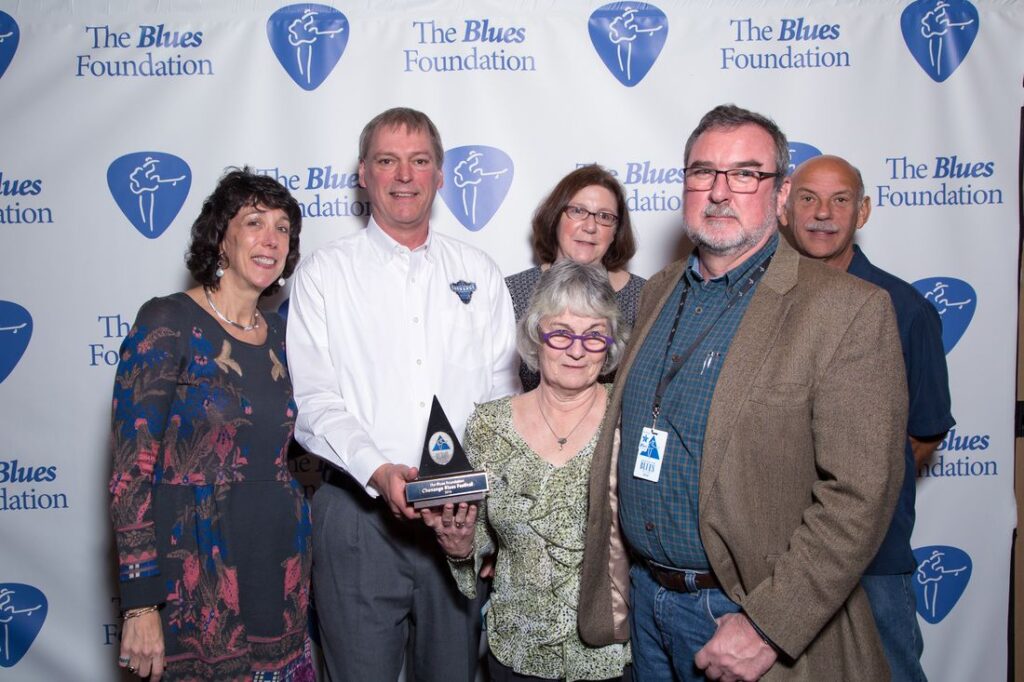 From left: Barbara Newman, CEO of The Blues Foundation, Chenango Blues Association representatives Eric Larsen, Pam Larsen, Linda Palmatier, Steve Palmatier and Blues Foundation Board President, Paul Benjamin.